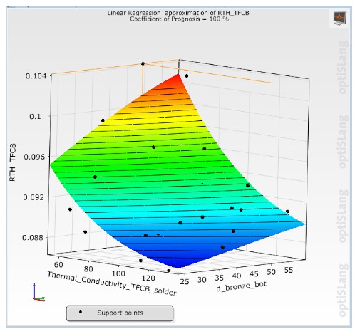 作為下一步,進行了數(shù)值實驗設計(DoE)。目標是確定哪些不同的參數(shù)(熱導率和釬焊金屬層的厚度)對基板的R th影響最大。對于這個DoE,OPTISLANG程序創(chuàng)建了30個模擬,分布在由參數(shù)邊界定義的整個設計空間中。在計算了這些結(jié)果并確定了它們的R th之后,創(chuàng)建了一個降階模型,該模型允許對輸入?yún)?shù)(熱導率和厚度)對結(jié)果(熱阻)的影響進行排序。用于模擬的參數(shù)的間隔見下表: