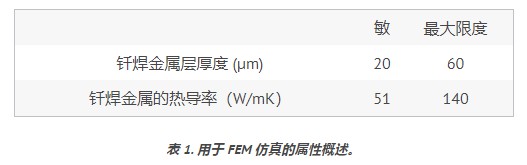釬焊金屬層的熱導率由其成分定義,其近似于青銅成分CuSn x。釬焊金屬層厚度的典型變化約為20至60 μm,并通過樣品的橫截面和隨后的二次電子顯微鏡分析進行估計。