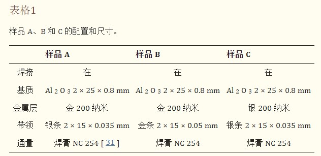 厚度為200nm的超薄金屬層沉積在800μm厚的氧化鋁(AI2O3)陶瓷基板上,金屬層使用PVD(物理氣相沉積)方法和Classic250真空系統(tǒng)制成,使用2mm寬的金屬條作為外部柔性引線,銦被用作焊料,示例配置顯示在表格1.