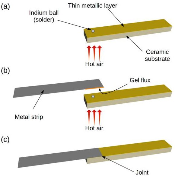 簡而言之,我們的方法包括間接加熱和熔化涂有金屬層的陶瓷基板上的焊料,然后引入帶有凝膠助焊劑的金屬條以促進(jìn)每個(gè)表面的焊接。在引入帶助焊劑的帶材后,立即開始聯(lián)合冷卻過程。整個(gè)過程只需要很短時(shí)間,三個(gè)步驟的過程如圖1所示。