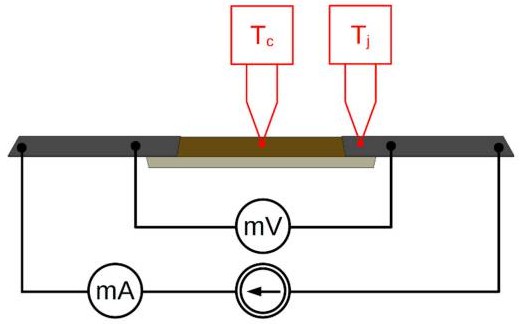 在室溫下測量樣品的電參數(shù)時(shí),我們關(guān)注的是電流在相同幾何形狀的樣品中產(chǎn)生的焦耳熱通量密度。目的是確定主要的熱源。如果接頭具有低電阻,則接頭區(qū)域不是主要的熱源。小型熱電偶(T型,線徑140 μm)連接到樣品表面的中心(T c)和接頭(T j)。在自然空氣對流條件下,不同電流下測得溫度(圖4)。