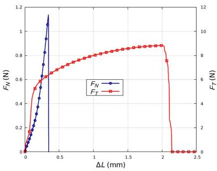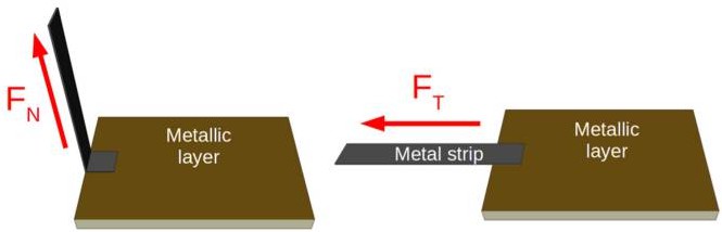 對層-箔接頭進(jìn)行強(qiáng)度測試,出于研究的目的我們制作了一系列12個(gè)相同的樣品,接頭面積為2x2mm。為了便于在CERT系統(tǒng)的副夾具中組裝樣品,使用了尺寸為12x10mm的較大陶瓷基板和尺寸為2x25mm的Ag條。將樣品拉至其斷裂點(diǎn)以確定接頭的極限抗拉強(qiáng)度,在整個(gè)測試過程中測量施加到樣品的力F和樣品的伸長率ΔL 。對施加到樣品的切向FT(6個(gè)樣本)和法向FN(6個(gè)樣本)力分量進(jìn)行了測試(圖5),結(jié)果確定了決定其強(qiáng)度的層-接頭-箔結(jié)構(gòu)的元素。