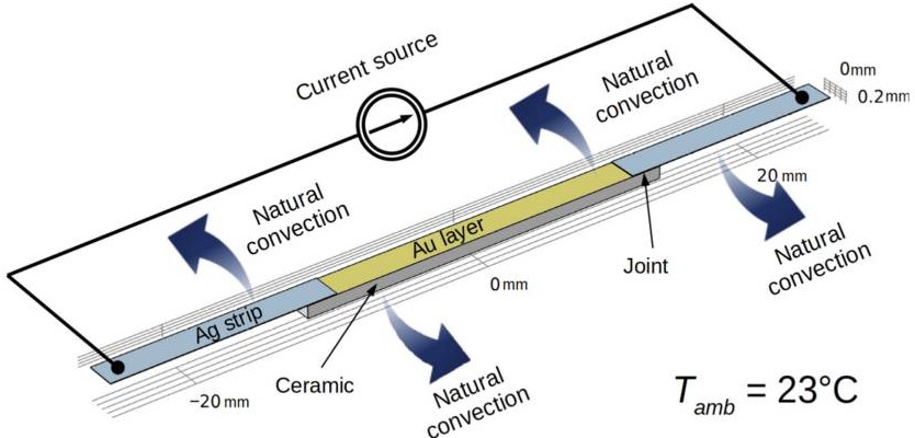 開發(fā)了一個(gè)數(shù)值模型來驗(yàn)證實(shí)驗(yàn)研究確定的主要焦耳熱源。該模型還使我們能夠分析樣品中的熱量分布。該模型在Comsol Multiphysics軟件(COMSOL Inc., Burlington, MA, USA)中實(shí)施。幾何和模型假設(shè)是根據(jù)在室溫下測試的樣品的尺寸和參數(shù)進(jìn)行的(圖6)。這使得可以比較結(jié)果并驗(yàn)證模型中使用的假設(shè)。根據(jù)觀察和顯微測量,假設(shè)以下尺寸:接頭厚度,20 μm;Au層的厚度,200 nm;銀條的厚度,35 μm。