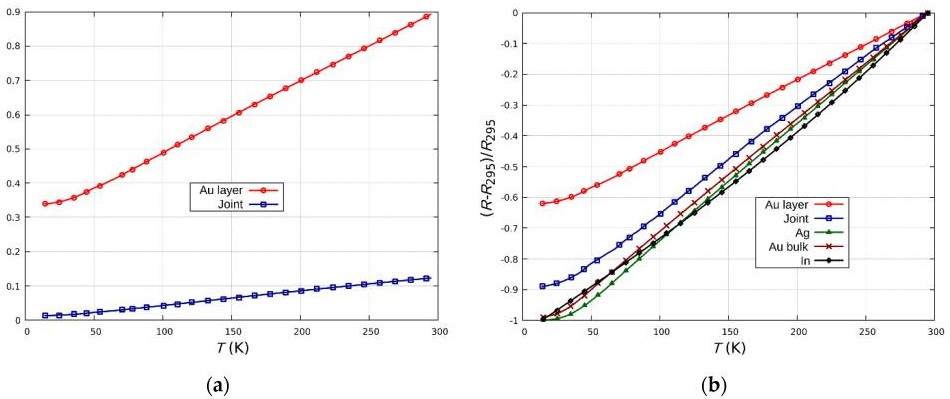 在很寬的溫度范圍內(nèi)進(jìn)行了溫度對Au層和Au/In/Ag接頭(樣品A)電阻影響的研究,主要是在15-300 K的低溫下。發(fā)現(xiàn)接頭的特性是可重復(fù)且未觀察到不連續(xù)性或突然的、不可預(yù)測的電阻變化(圖10)。這證明了接頭的電氣和機(jī)械性能在很寬的溫度范圍內(nèi)的穩(wěn)定性。結(jié)果表明,Au層和接頭在35-300 K范圍內(nèi)電阻對溫度的線性相關(guān)性,這是金屬和金屬合金的典型關(guān)系,證明了接頭的穩(wěn)定性。穩(wěn)定性是關(guān)節(jié)的一個(gè)非常重要的特性,特別是對于在寬溫度范圍內(nèi)工作的低溫傳感器。