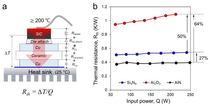 在碳化硅微加熱器芯片中,并用于與各種類型的DBC陶瓷基板如氮化鋁和氧化鋁以及氮化硅鍵合。Ag燒結(jié)連接被用作連接材料的模具,因為它可以承受高溫應(yīng)用,并且在許多先前的研究中都有講到,測量了不同類型DBC的SiC微加熱器芯片到冷卻系統(tǒng)的穩(wěn)態(tài)熱阻。此外,還進行了功率循環(huán)測試,以研究每種類型DBC陶瓷基板上的SiC微加熱器芯片貼片結(jié)構(gòu)的高溫可靠性。通過微焦點3D計算機斷層掃描(CT) X射線系統(tǒng)分析電源循環(huán)后的故障。這種方法可以顯著區(qū)別于傳統(tǒng)的熱循環(huán)測試,因為可以在重復的熱環(huán)境中考慮材料的熱性能。