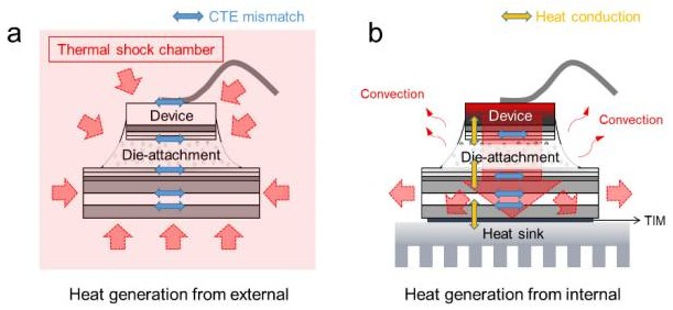 此外,WBG半導體器件的工作溫度(>250℃)比基于硅的器件(<150℃)如圖1/2/3所示,這意味著可以從功率轉(zhuǎn)換系統(tǒng)中去除龐大、復雜和沉重的冷卻系統(tǒng)。逆變器和轉(zhuǎn)換器汽車部件可以通過在高溫環(huán)境中的簡單散熱設(shè)計變得更小。通常,功率模塊的結(jié)構(gòu)具有半導體芯片和散熱/絕緣板的多層結(jié)構(gòu),所有層都有不同的材料特性,例如熱膨脹系數(shù)(CTE),這會在重復操作過程中引起熱機械應(yīng)力。