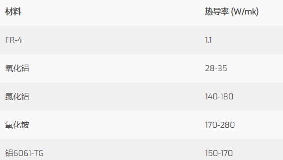 FR-4 0.8~1.1W/mk、氧化鋁28~35W/mk、氮化鋁140~180W/mk、氧化鈹170~280W/mk