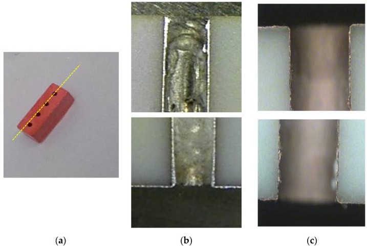 在制造中具有四個通孔的微波介質(zhì)陶瓷濾波器如圖1所示,一個使用激光鉆通孔。圖1b、c顯示橫截面(沿圖中所示的虛線圖1a)分別用傳統(tǒng)的LTCC工藝和低溫金屬化工藝制備的過濾器。圖1b、c表明低溫陶瓷金屬化工藝提供的金屬厚度和尺寸比傳統(tǒng)的LTCC工藝提供的更均勻和光滑,這將避免與傳統(tǒng)工藝相關(guān)的金屬堵塞問題。此外,微波介質(zhì)濾波器的批次無需單獨檢查,節(jié)省了能源、勞動力、成本和時間。