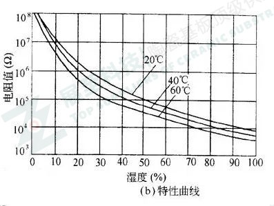 濕度傳感器的結(jié)構(gòu)如圖(a)所示,該傳感器的電阻值和濕度關系曲線如圖(b)所示。當曲線上可知濕度加大時,傳感器電阻值就會減小。