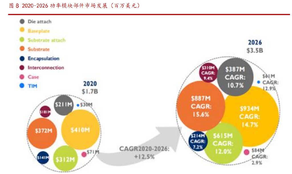 而隨著光伏、風(fēng)電蓬勃發(fā)展,新能源汽車(chē)滲透率提高,功率模塊帶動(dòng) AlN 陶瓷 基板需求增長(zhǎng)。IGBT 功率器件是光伏、風(fēng)力發(fā)電時(shí)電能轉(zhuǎn)換與電路控制的核心,同時(shí)也在新能源汽車(chē)的電動(dòng)機(jī)等核心部件中起著關(guān)鍵作用,隨著光伏、風(fēng)電占比的不斷提高,功率器件以及封裝所用陶瓷基板的需求將迎來(lái)大規(guī)模增長(zhǎng)。在傳統(tǒng)的 IGBT模塊中,氧化鋁陶瓷基板是最常用的陶瓷基板,但氧化鋁陶瓷基片相對(duì)低的熱導(dǎo)率、與 硅的熱膨脹系數(shù)匹配不好,隨著新能源汽車(chē)向著高壓化、高功率化發(fā)展,氧化鋁已不再適合作為封裝材料。近年來(lái),AlN、Si3N4 陶瓷基板以其耐高溫和熱穩(wěn)定性好、介電常數(shù)和介質(zhì)損耗低、耐磨損、耐腐蝕等優(yōu)異的性能,在 IGBT 模塊封裝中得到青睞, 逐步替代 Al2O3 陶瓷基板。此外,新能源汽車(chē)用 IGBT 模塊的功率導(dǎo)電端子需要承載數(shù) 百安培的大電流,對(duì)電導(dǎo)率和熱導(dǎo)率有較高的要求,車(chē)載環(huán)境中還要承受一定的振動(dòng)和沖擊力,機(jī)械強(qiáng)度要求高,因此Si3N4憑借其硬度高、機(jī)械性能好的特性在新能源 車(chē)用 IGBT 模塊中得到了更廣泛的應(yīng)用。隨著光風(fēng)儲(chǔ)能與新能源汽車(chē)行業(yè)的快速發(fā)展帶動(dòng)功率模塊需求激增,氮化鋁與氮化硅陶瓷基板的市場(chǎng)也隨之?dāng)U大。