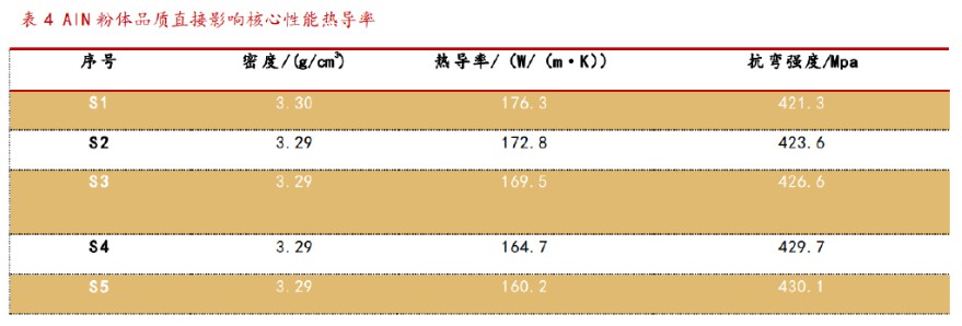 高性能的氮化鋁關(guān)鍵在于粉體制備。高質(zhì)量粉末原料是獲得高性能氮化鋁制品的先決條件,要制備高性能的氮化鋁制品,首先需要制備出高純度、細(xì)粒度、分散性好和燒結(jié)性優(yōu)的氮化鋁粉末。如何提高氮化鋁轉(zhuǎn)化率,降低粉末雜質(zhì)含量以及反應(yīng)能耗,縮短工藝流程,節(jié)約成本是制粉過程中最關(guān)心的問題。因此,為了制備高相對密度、高導(dǎo)熱和高強(qiáng)度的氮化鋁陶瓷,如何制備優(yōu)質(zhì)的氮化鋁粉末得到了國內(nèi)外研究者們的密切關(guān)注。高品質(zhì)粉體對下游生產(chǎn)影響大,我們認(rèn)為上下游一體粉體兼有的企業(yè)優(yōu)勢更大。根據(jù)《高性能AlN粉體合成、特性及成瓷驗證》中提到,高品質(zhì)AlN粉體是制備高性能AlN陶瓷基板的重要的前提與保障。不同品質(zhì)的AlN粉體制備的AlN陶瓷基板的密度數(shù)值穩(wěn)定,均保持在3.29-3.30 g/cm3,但其熱導(dǎo)率和抗彎強(qiáng)度的數(shù)值變化幅度較大。